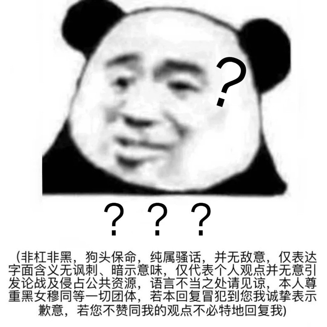 ??非杠非黑,狗头保命,纯属骚话,并无敌意,仅表达字面含义无讽刺、暗示意味,仅代表个人观点并无意引发论战及侵占公共资源,语言不当之处请见谅,本人尊重黑女穆同等一切团体,若本回复冒犯到您我诚挚表示歉意,若您不赞同我的观点不必特地回复我)