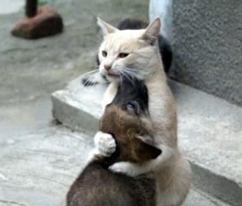 白猫把黑狗抱在怀怉里,安慰一下