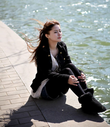 坐在湖边吹风的美女