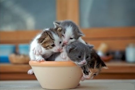 几只小猫挤在一个碗里