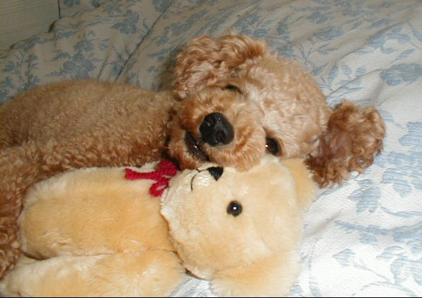 狗狗抱着卡通熊睡觉