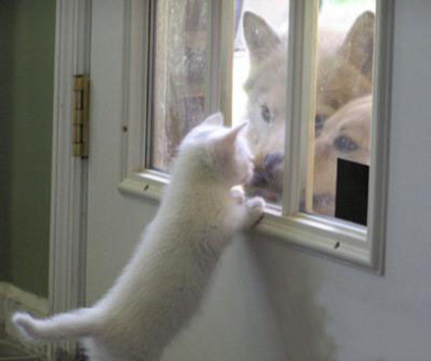 小猫爬在窗户上凝视