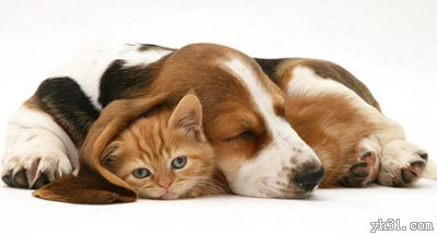 躲在大狗耳朵下的小猫咪